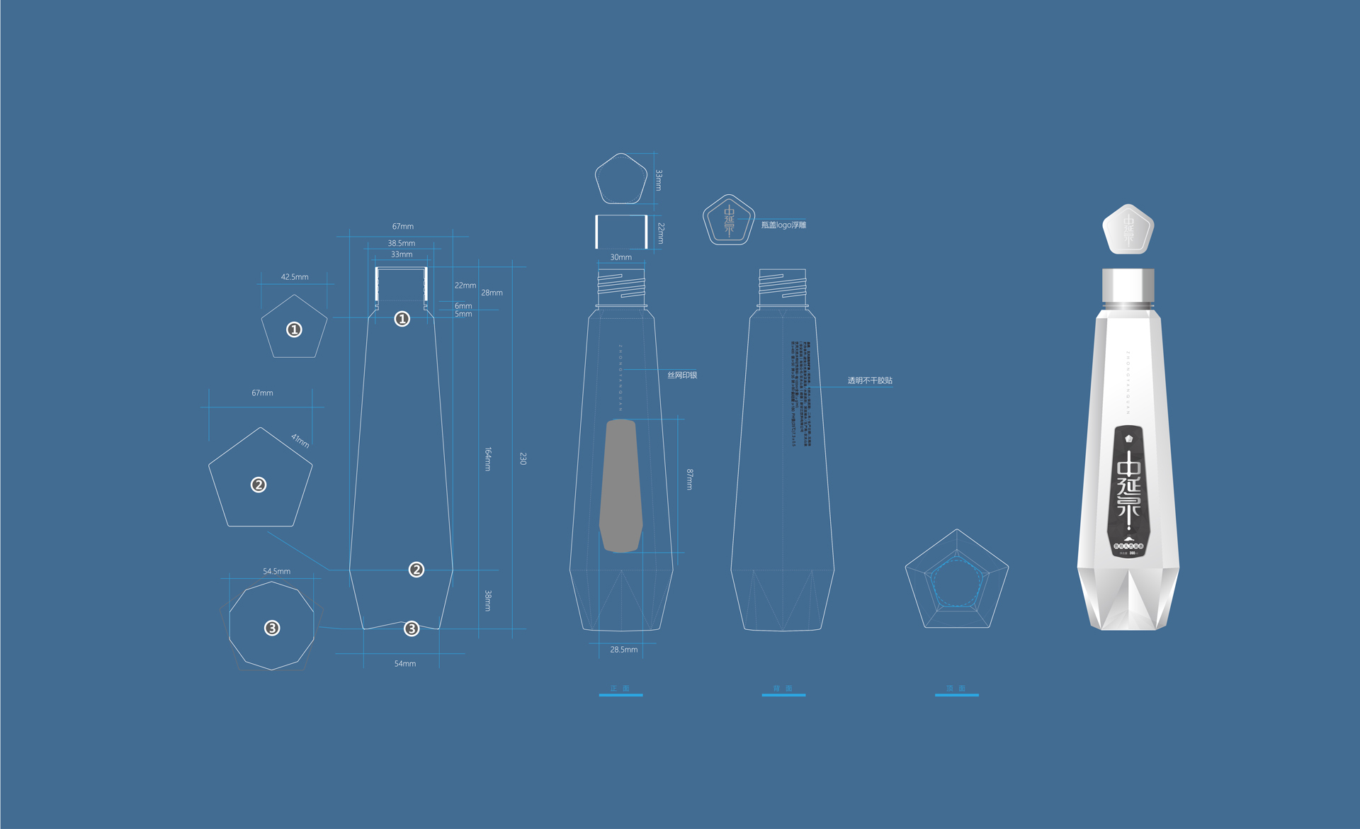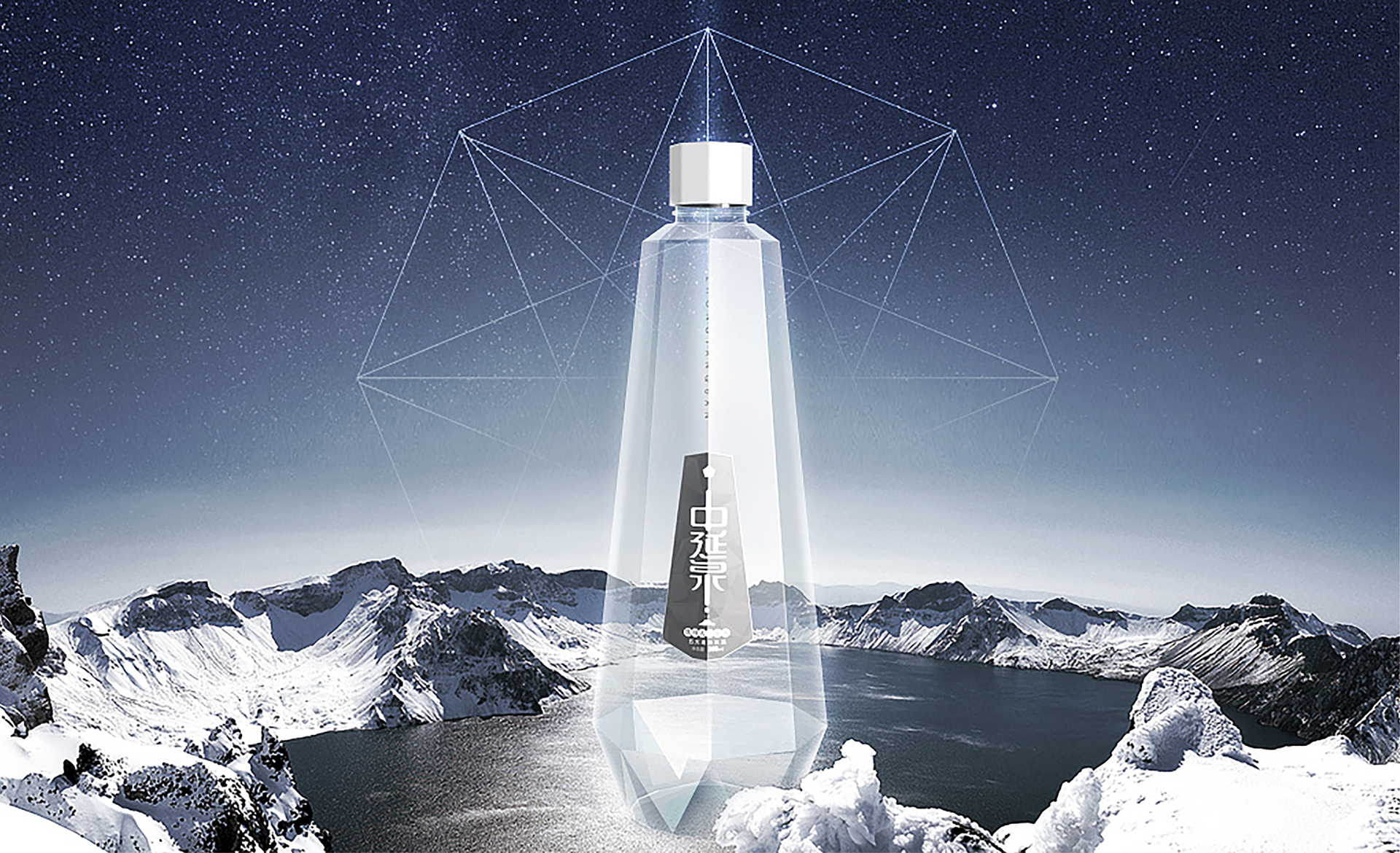 包裝設計概念采用了“鉆石”的外造型,是一個五邊形的異形包裝, 五邊形也喻意著五大連池。整體包裝呈現出一個結晶狀態的造型,也與五大連池的冰川水起到一個呼應作用。設計風格體現出很強的商務感,高級感,符合中延集團調性和品質感。