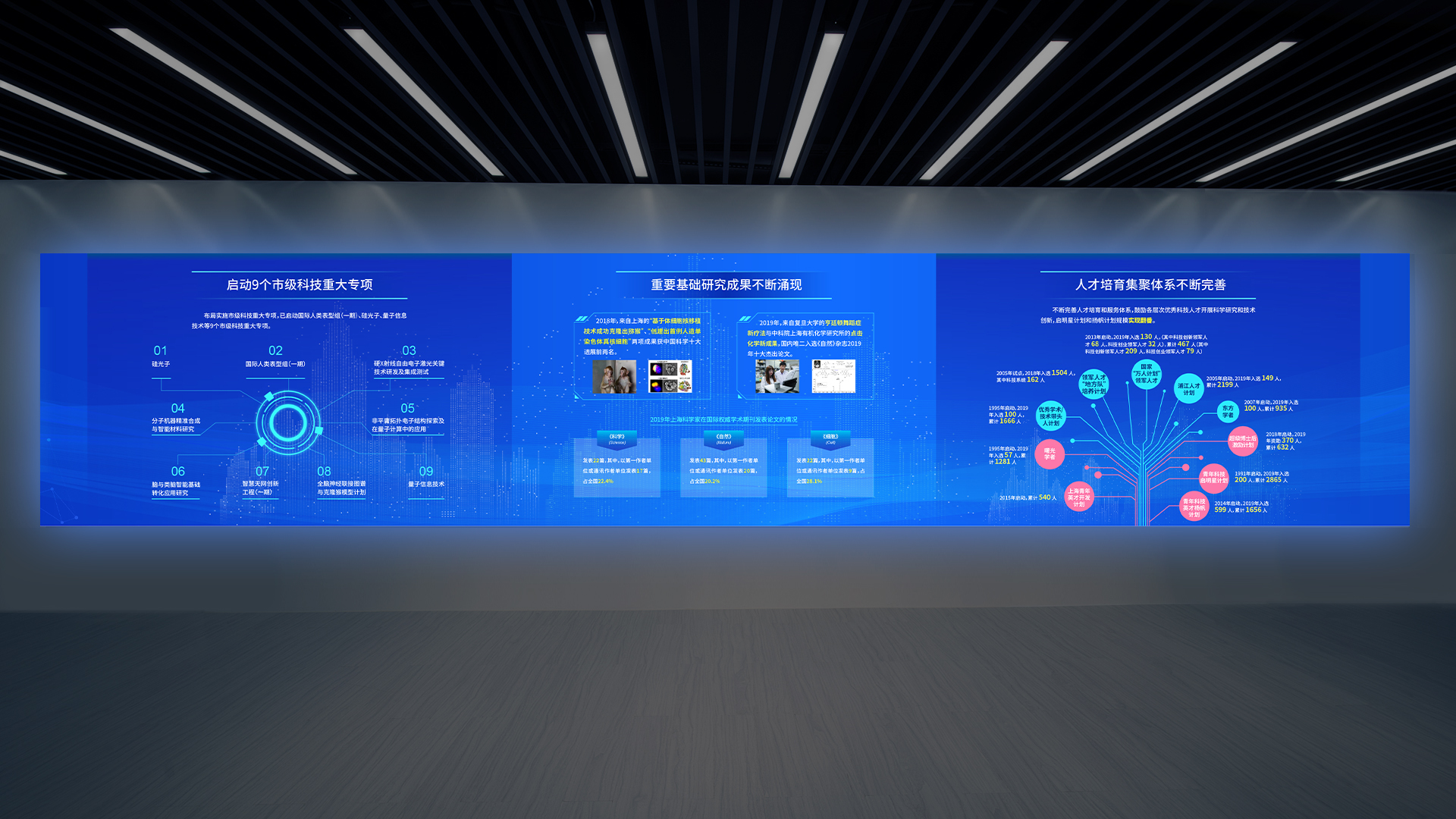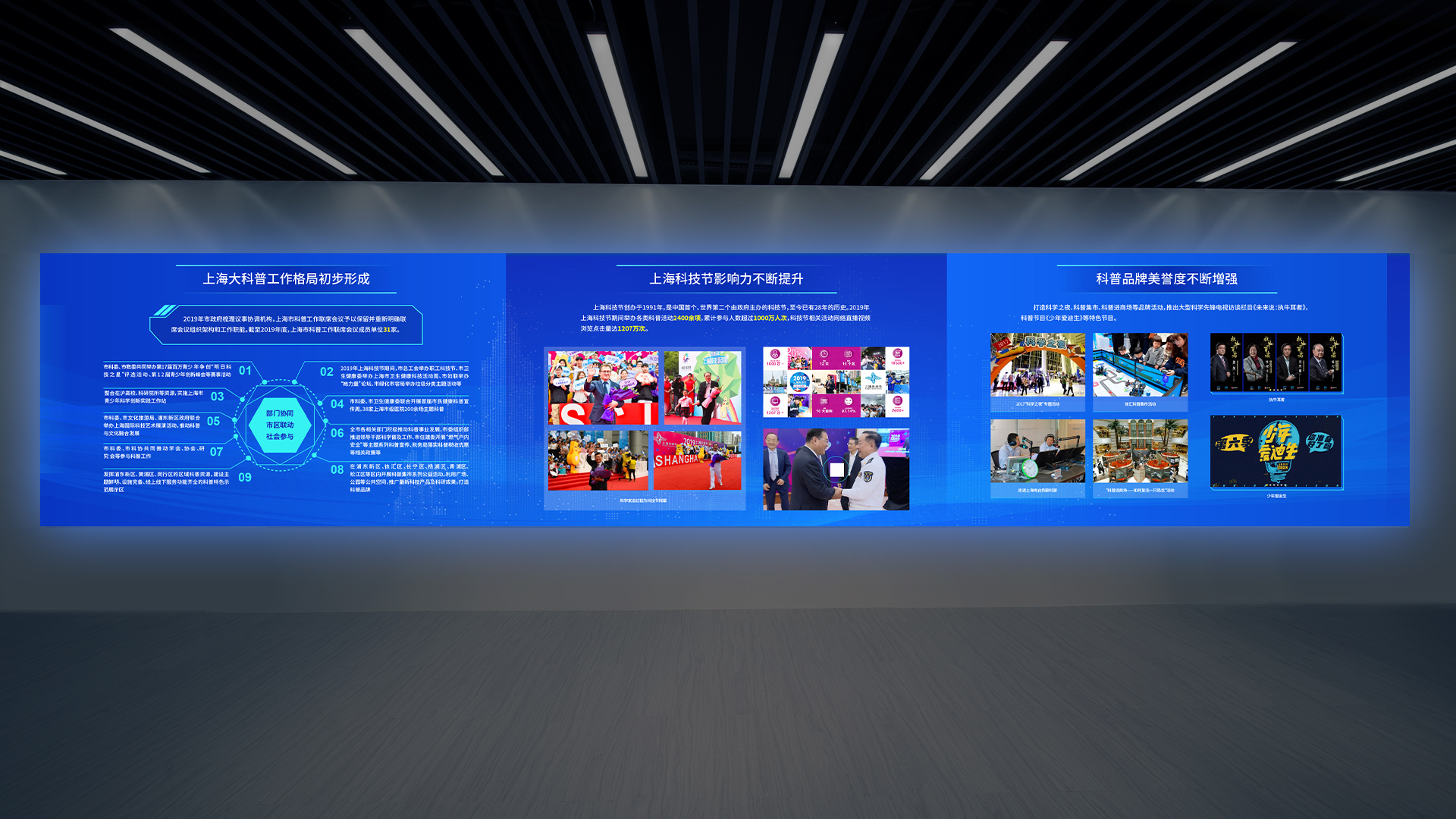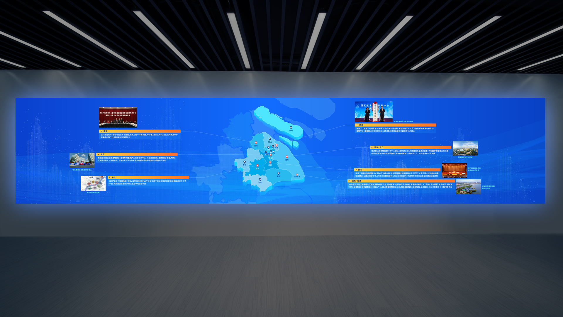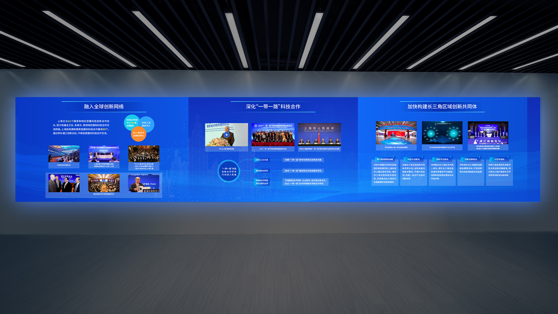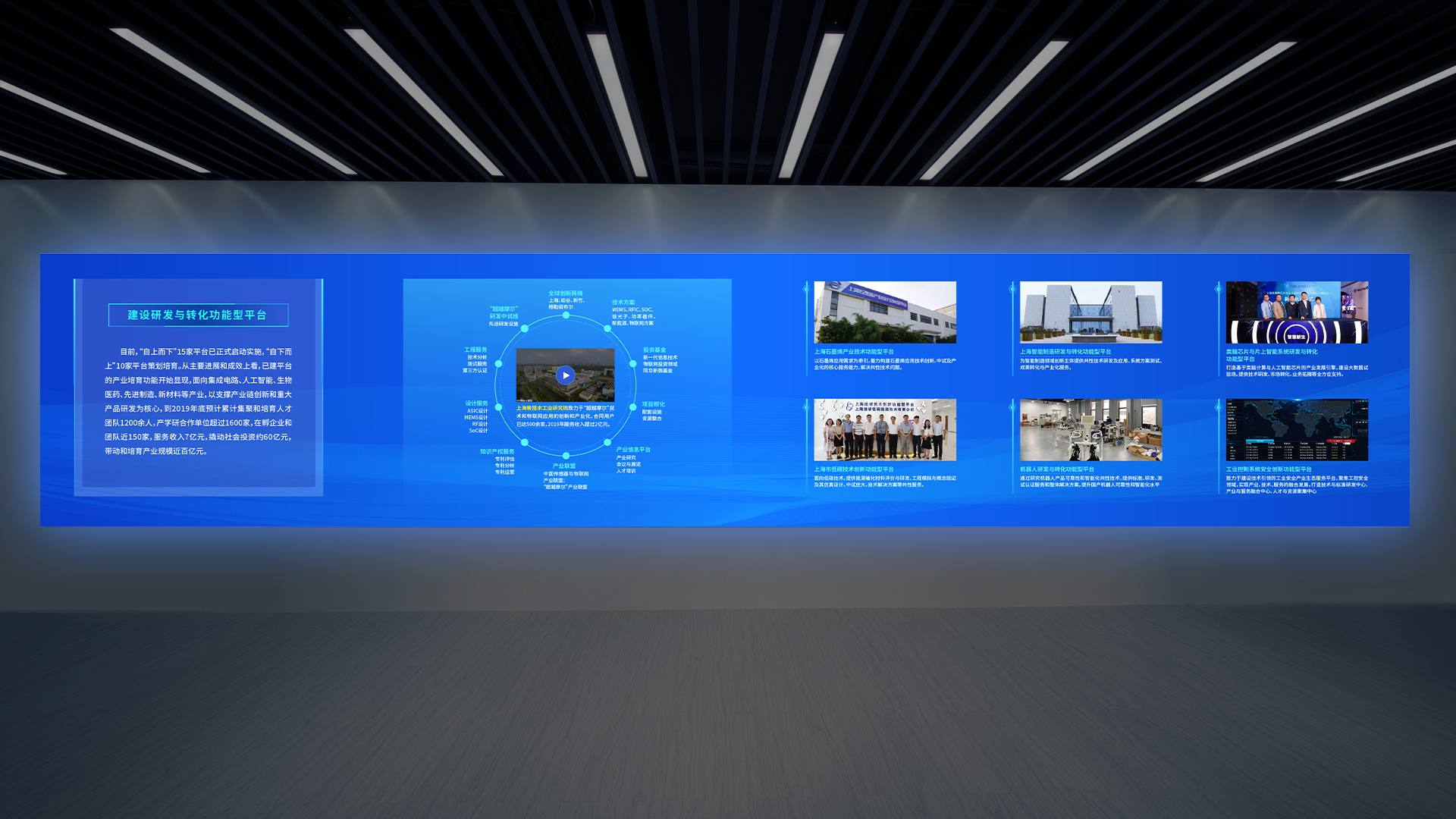 本次和與德為上海科創之窗展廳設計的風格現代、簡約,以創新和科技為主題,強調科技和人文的融合。展廳的整體空間采用白色為主色調,配合一些暖色調的燈光和配飾,營造出一個舒適、溫馨的氛圍。讓來訪者可以親身感受科技的魅力,增加參觀者的參與感和體驗感。此外,展廳內還設置了創新創業項目展示區、創新創業成果展示區等,展示了科創之窗所支持的創新創業項目和成果,讓來訪者了解到科技創新的最新成果和前沿技術。整個展廳的設計風格簡潔、明快、富有活力,很好地展現了上海科創之窗的創新、開放和活力的形象。